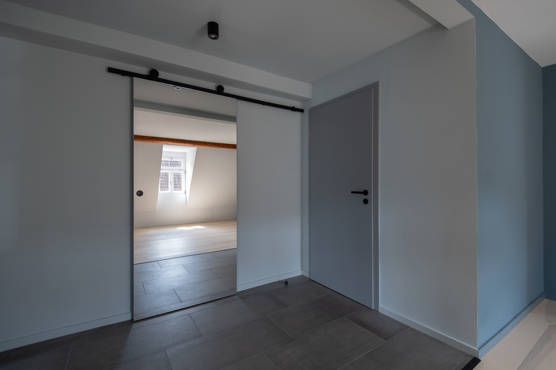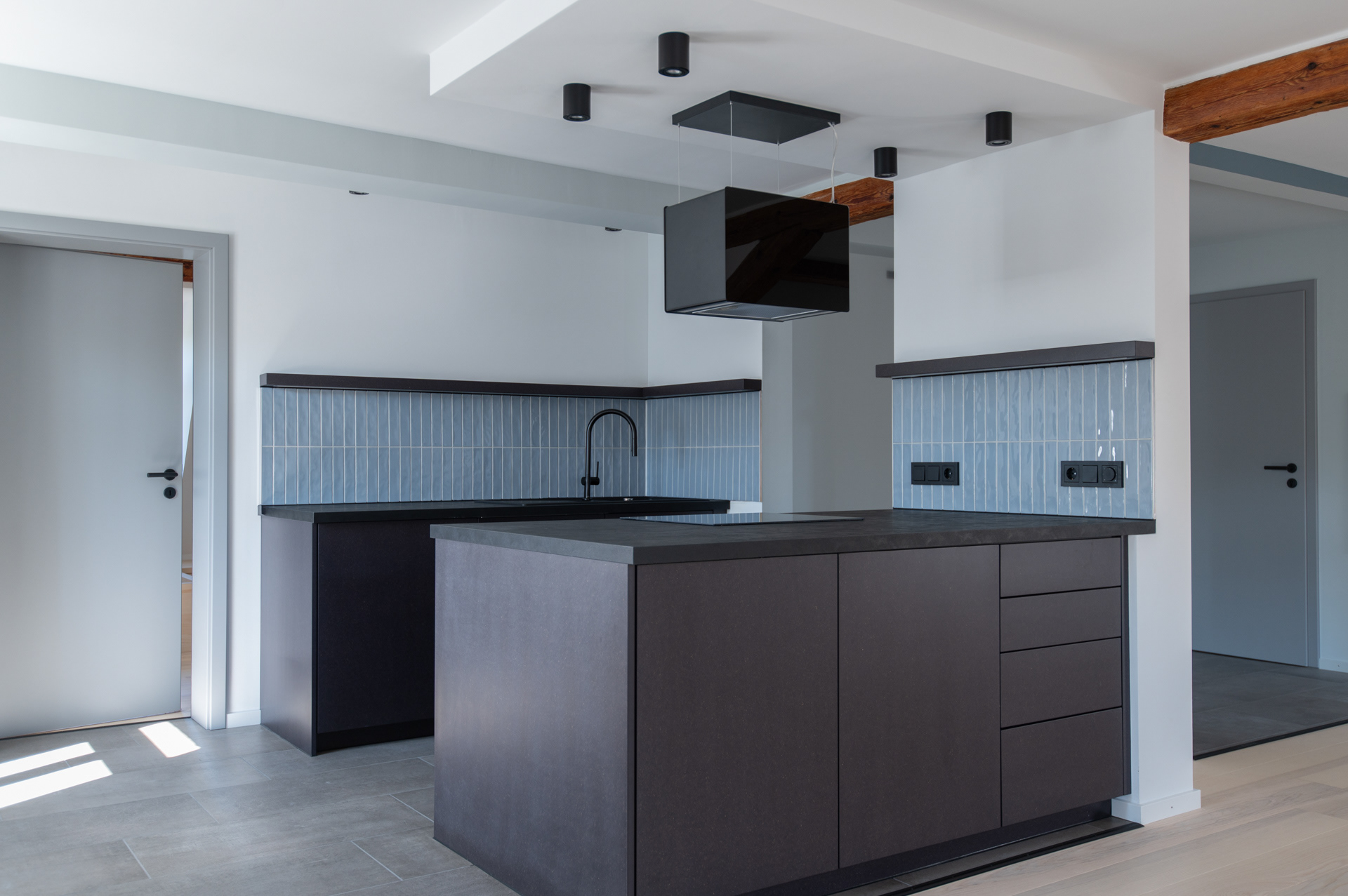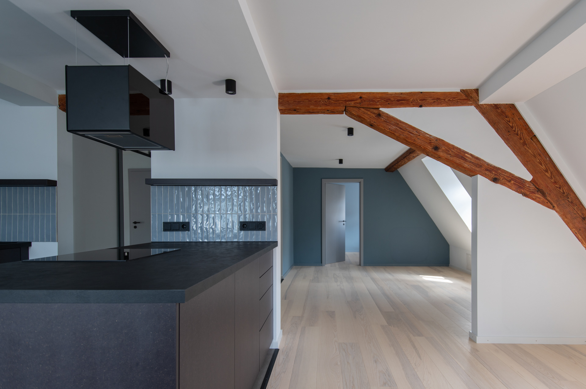 The attic of a listed half-timbered building traditionally consists of several small rooms. As part of a redesign, the client wanted to create open and bright living spaces with a reference to the historic building. The load-bearing structure forms the basic shape of the flat. Almost all non-load-bearing walls were removed, creating new visual axes. Opening up the rooms results in a spacious and wide living area, which can be separated from individual adjoining rooms by sliding and door elements. The open kitchen stands out as a central element through its form and color scheme and creates visual references to the surrounding living areas through its division. Various materials and colours set accents in the rooms and in the interior fittings and create an overarching connection. Mirrored surfaces were also used, such as the sliding door in the hallway, which complements the visual axis of the exposed framework along the ceiling structure.