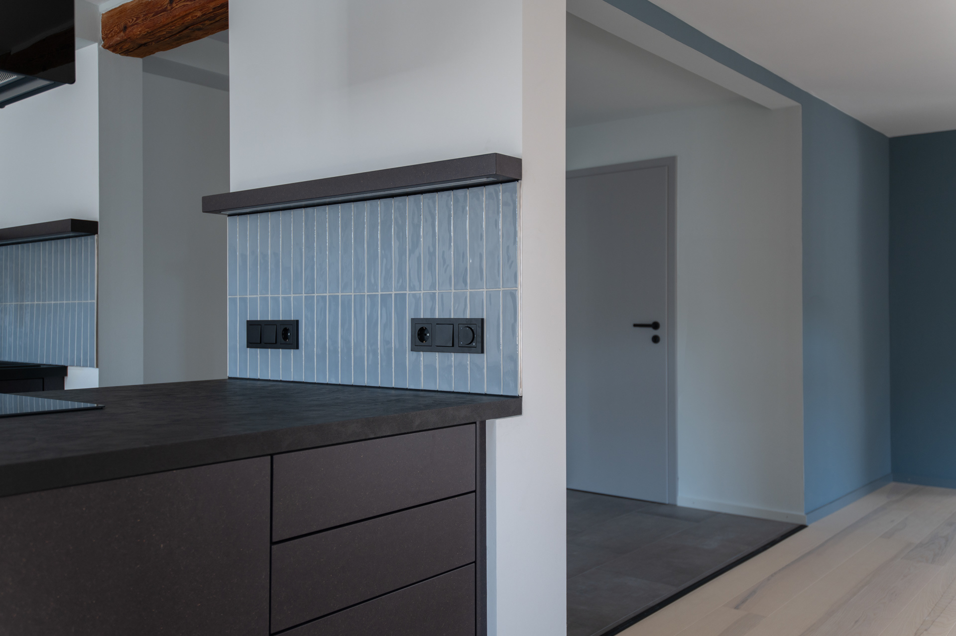 Das Dachgeschoss eines denkmalgeschützten Fachwerkgebäudes besteht traditionell aus mehreren kleinen Räumen. Der Wunsch der Auftraggeber:innen war es, im Rahmen einer Neugestaltung offene und helle Wohnräume mit Bezug zum historischen Bestand zu gestalten. Die tragende Struktur bildet die Grundform der Wohnung. Fast alle nichttragenden Wände wurden entfernt, wodurch neue Sichtachsen entstehen. Durch das Öffnen der Räume ergibt sich ein großzügiger und weiter Wohnbereich, der durch Schiebe- und Türelemente von einzelnen Nebenräumen getrennt werden kann. Die offene Küche hebt sich als zentrales Element in Form und Farbgebung ab und schafft durch die Zweiteilung Blickbezüge in die umliegenden Wohnbereiche. Verschiedene Materialien und Farben setzen Akzente in den Räumen sowie im Innenausbau und stellen eine übergeordnete Verbindung dar. Zusätzlich wurden verspiegelte Oberflächen eingesetzt, wie die Schiebetür im Flur, welche die Sichtachse des freigelegten Fachwerks entlang der Deckenstruktur, ergänzt.